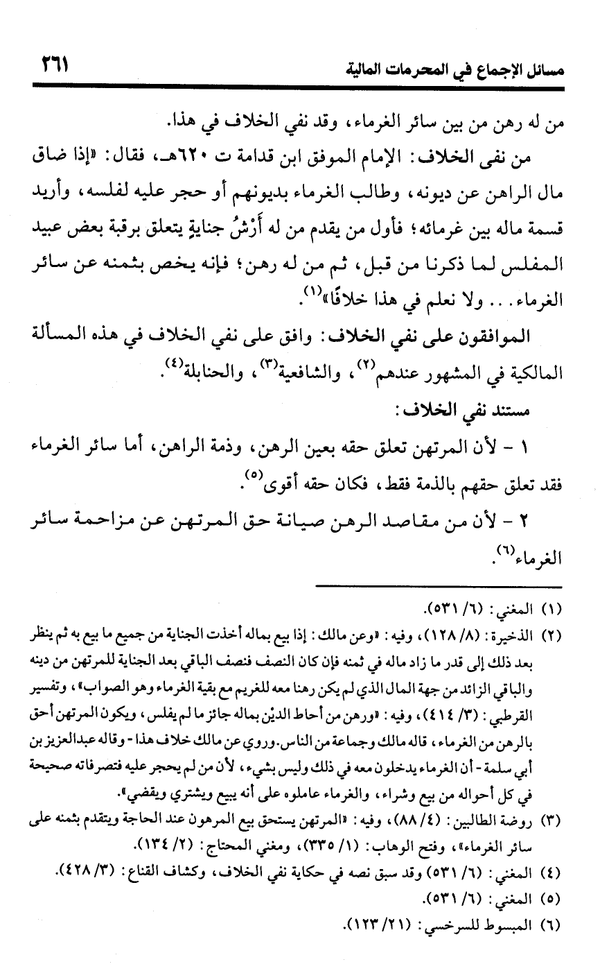 • من نفى الخلاف: الإمام الموفق ابن قدامة ت 620 هـ، فقال: "إذا ضاق مال الراهن عن ديونه، وطالب الغرماء بديونهم أو حجر عليه لفلسه، وأريد قسمة ماله بين غرمائه؛ فأول من يقدم من له أَرْشُ جنايةٍ يتعلق برقبة بعض عبيد المفلس لما ذكرنا من قبل، ثم من له رهن؛ فإنه يخص بثمنه عن سائر الغرماء. . . ولا نعلم في هذا خلافًا" (¬1).