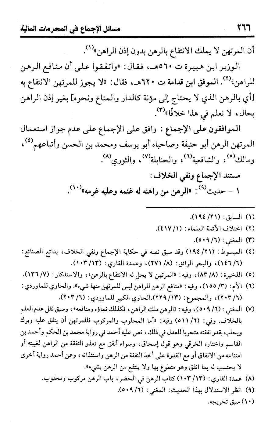 (¬7) المغني: (6/ 509)، وفيه: "الرهن ملك الراهن، فكذلك نماؤه ومنافعه"، وسبق نقل عدم العلم بالخلاف. وفي: (6/ 511) وفيه: "أما المحلوب والمركوب فللمرتهن أن ينفق عليه ويرك ويحلب بقدر نفقته متحريا للعدل في ذلك، نص عليه أحمد في رواية محمد بن الحكم وأحمد بن القاسم واختاره الخرقي وهو قول إسحاق، وسواء أنفق مع تعذر النفقة من الراهن لغيبته أو امتناعه من الإنفاق أو مع القدرة على أخذ النفقة من الرهن واستئذانه، وعن أحمد رواية أخرى لا يحتسب له بما أنفق وهو متطوع بها ولا ينتفع من الرهن بشيء".