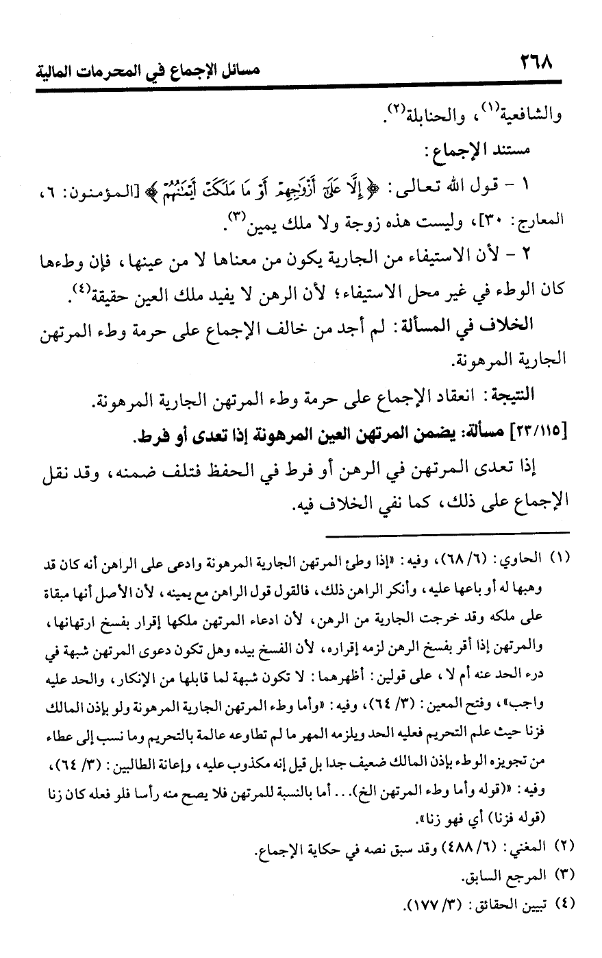 • الخلاف في المسألة: لم أجد من خالف الإجماع على حرمة وطء المرتهن الجارية المرهونة.Rانعقاد الإجماع على حرمة وطء المرتهن الجارية المرهونة.