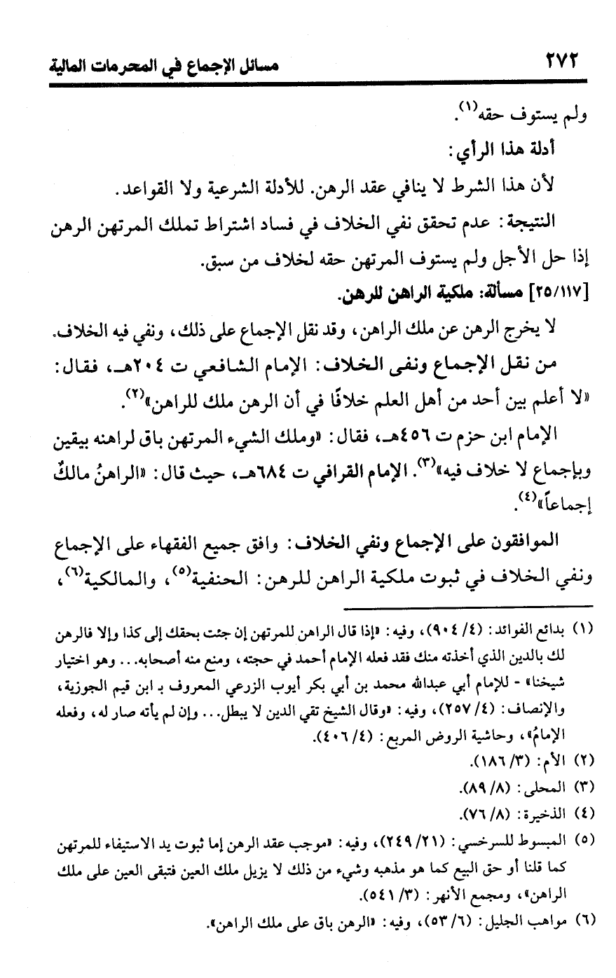 الإمام ابن حزم ت 456 هـ، فقال: "وملك الشيء المرتهن باق لراهنه بيقين وبإجماع لا خلاف فيه" (¬3). الإمام القرافي ت 684 هـ، حيث قال: "الراهنُ مالكٌ إجماعًا" (¬4).