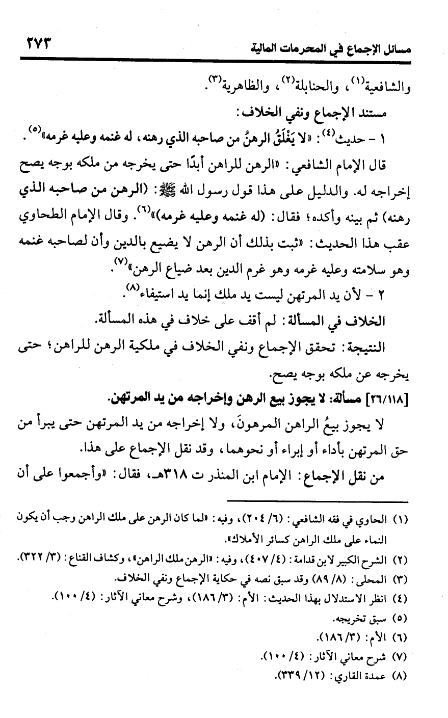 • الخلاف في المسألة: لم أقف على خلاف في هذه المسألة.Rتحقق الإجماع ونفي الخلاف في ملكية الرهن للراهن؛ حتى يخرجه عن ملكه بوجه يصح.
