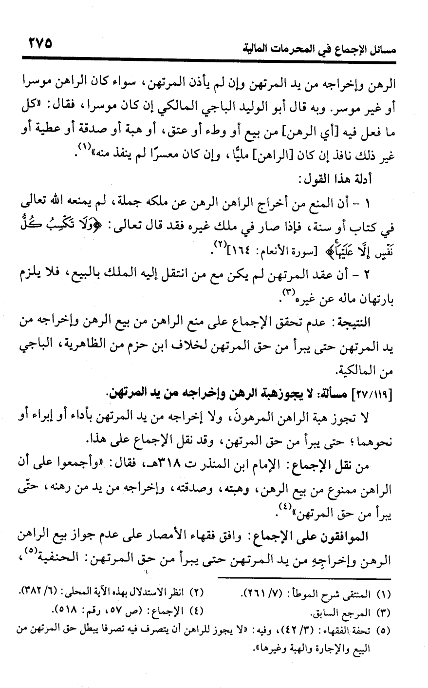 2 - أن عقد المرتهن لم يكن مع من انتقل إليه الملك بالبيع، فلا يلزم بارتهان ماله عن غيره (¬3).Rعدم تحقق الإجماع على منع الراهن من بيع الرهن وإخراجه من يد المرتهن حتى يبرأ من حق المرتهن لخلاف ابن حزم من الظاهرية، الباجي من المالكية.
