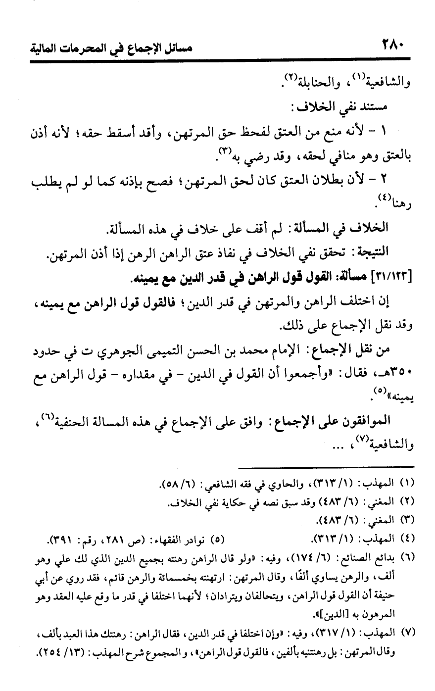 • من نقل الإجماع: الإمام محمد بن الحسن التميمى الجوهري ت في حدود 350 هـ، فقال: "وأجمعوا أن القول في الدين -في مقداره- قول الراهن مع يمينه" (¬5).