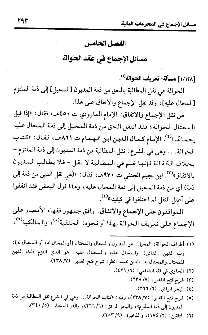 (¬5) شرح فتح القدير: (7/ 238)، وفيه: "كتاب الحوالة. . . وهي في الشرع نقل المطالبة من ذمة المديون إلى ذمة الملتزم"، والبحر الرائق: (6/ 266)، والدر المختار: (5/ 340).