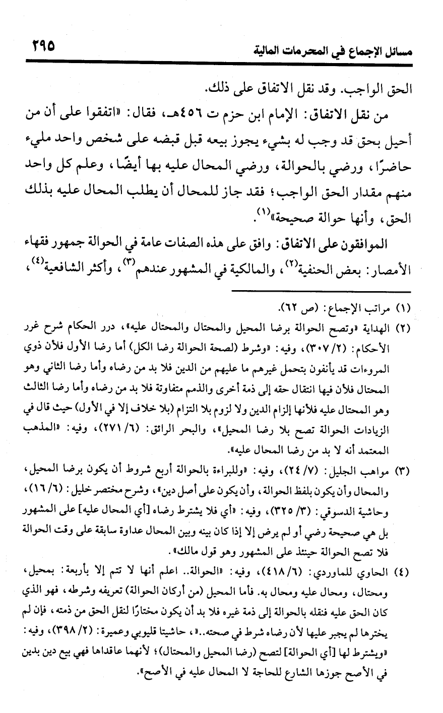 • من نقل الاتفاق: الإمام ابن حزم ت 456 هـ، فقال: "اتفقوا على أن من أحيل بحق قد وجب له بشيء يجوز بيعه قبل قبضه على شخص واحد مليء حاضرًا، ورضي بالحوالة، ورضي المحال عليه بها أيضًا، وعلم كل واحد منهم مقدار الحق الواجب؛ فقد جاز للمحال أن يطلب المحال عليه بذلك الحق، وأنها حوالة صحيحة" (¬1).
