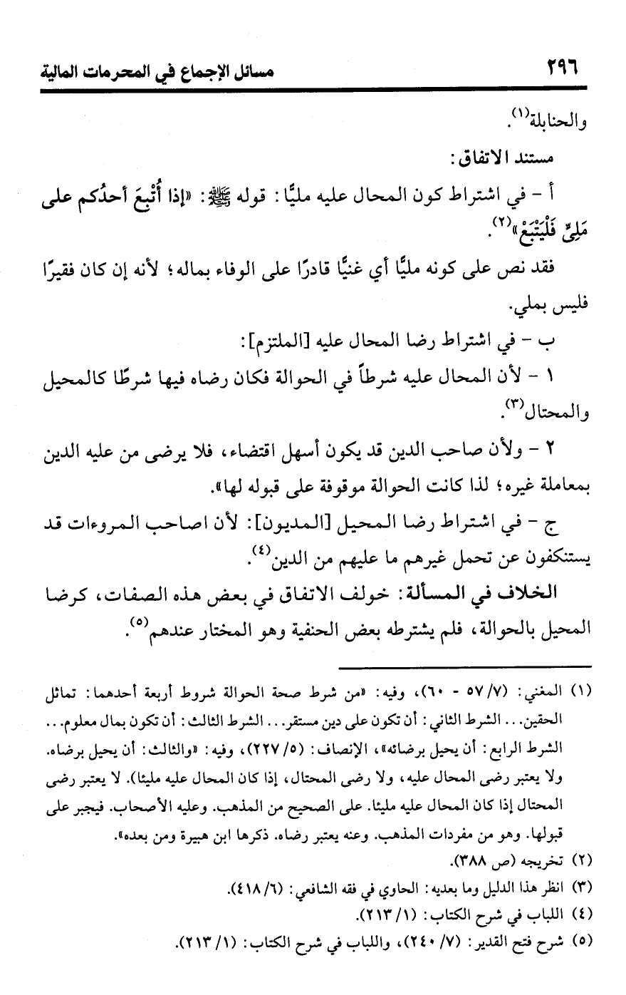 • الخلاف في المسألة: خولف الاتفاق في بعض هذه الصفات، كرضا المحيل بالحوالة، فلم يشترطه بعض الحنفية وهو المختار عندهم (¬5).