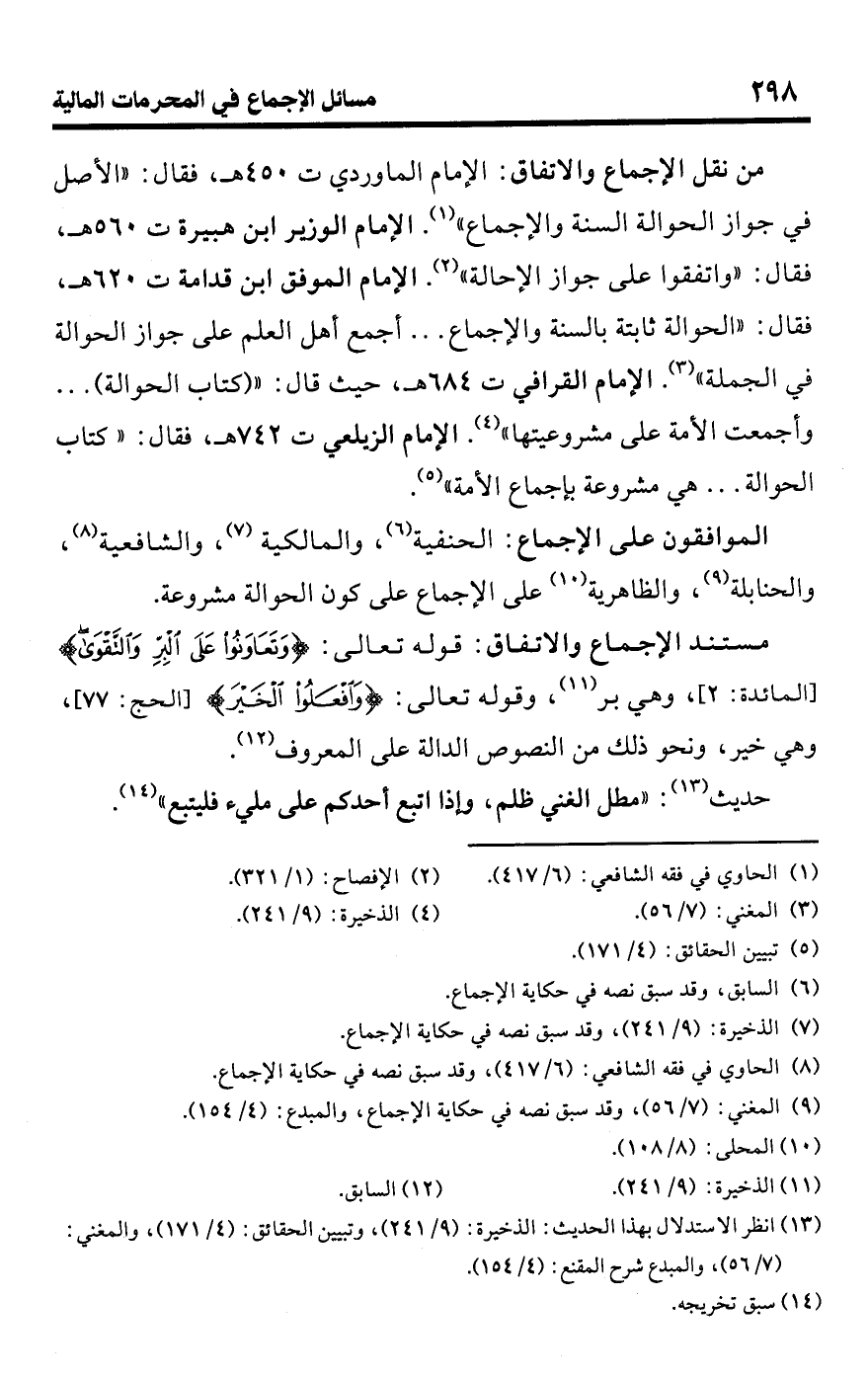 • من نقل الإجماع والاتفاق: الإمام الماوردي ت 450 هـ، فقال: "الأصل في جواز الحوالة السنة والإجماع" (¬1). الإمام الوزير ابن هبيرة ت 560 هـ، فقال: "واتفقوا على جواز الإحالة" (¬2). الإمام الموفق ابن قدامة ت 620 هـ، فقال: "الحوالة ثابتة بالسنة والإجماع. . . أجمع أهل العلم على جواز الحوالة في الجملة" (¬3). الإمام القرافي ت 684 هـ، حيث قال: " (كتاب الحوالة). . . وأجمعت الأمة على مشروعيتها" (¬4). الإمام الزيلعي ت 742 هـ، فقال: "كتاب الحوالة. . . هي مشروعية بإجماع الأمة" (¬5).