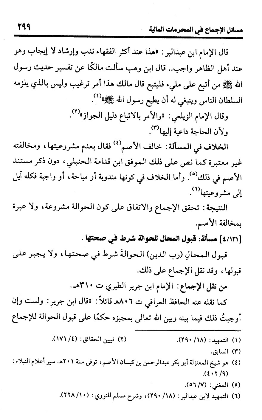 كما نقله عنه الحافظ العراقي ت 806 هـ قائلًا: "قال ابن جرير: ولست وإن أوجبتُ ذلك فيما بينه وبين اللَّه تعالى بمجبزه حكمًا على قبول الحوالة للإجماع