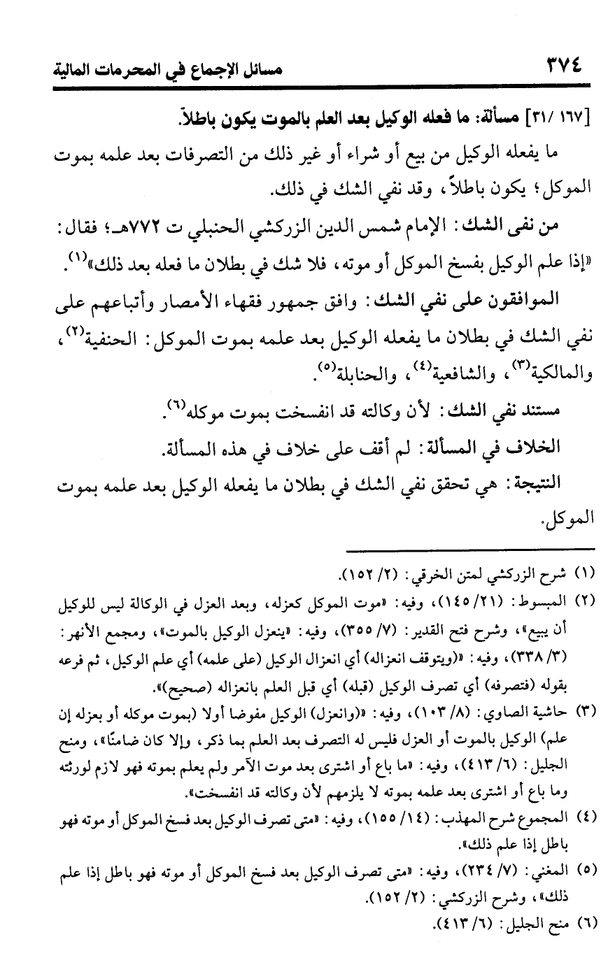 • من نفى الشك: الإمام شمس الدين الزركشي الحنبلي ت 772 هـ؛ فقال: "إذا علم الوكيل بفسخ الموكل أو موته، فلا شك في بطلان ما فعله بعد ذلك" (¬1).