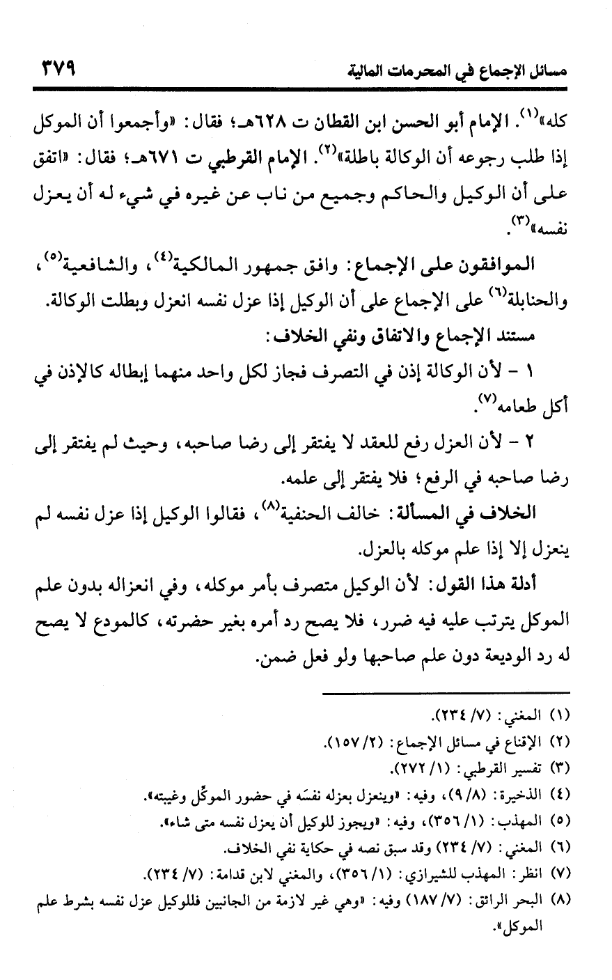 كله" (¬1). الإمام أبو الحسن ابن القطان ت 628 هـ؛ فقال: "وأجمعوا أن الموكل إذا طلب رجوعه أن الوكالة باطلة" (¬2). الإمام القرطبي ت 671 هـ؛ فقال: "اتفق على أن الوكيل والحاكم وجميع من ناب عن غيره في شيء له أن يعزل نفسه" (¬3).