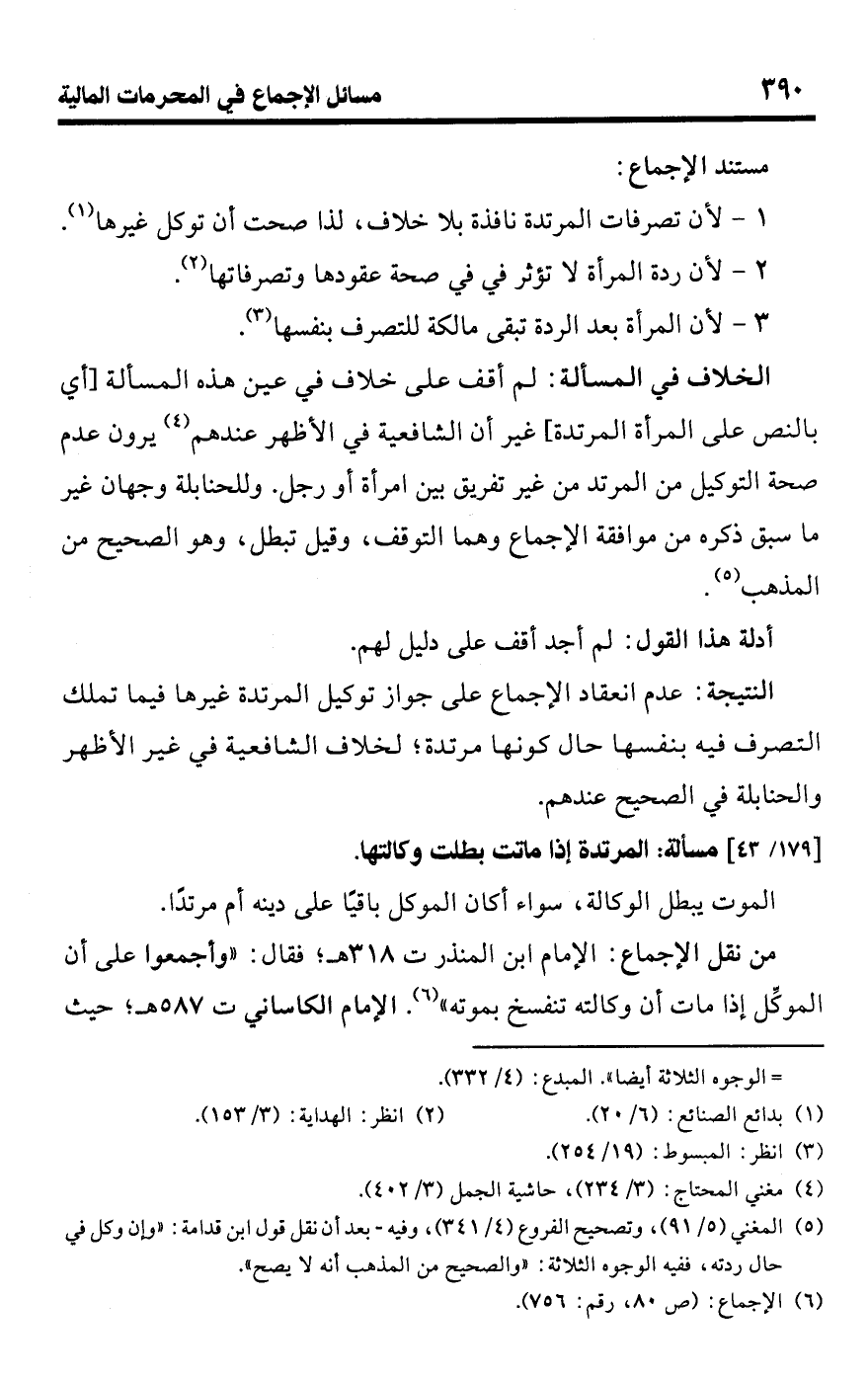 • من نقل الإجماع: الإمام ابن المنذر ت 318 هـ؛ فقال: "وأجمعوا على أن الموكِّل إذا مات أن وكالته تنفسخ بموته" (¬6). الإمام الكاساني ت 587 هـ؛ حيث