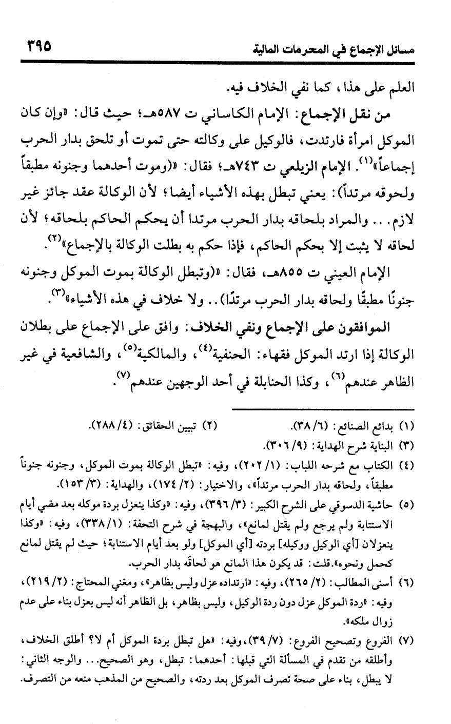 • من نقل الإجماع: الإمام الكاساني ت 587 هـ؛ حيث قال: "وإن كان الموكل امرأة فارتدت، فالوكيل على وكالته حتى تموت أو تلحق بدار الحرب إجماعًا" (¬1). الإمام الزيلعي ت 743 هـ؛ فقال: " (وموت أحدهما وجنونه مطبقًا ولحوقه مرتدًا): يعني تبطل بهذه الأشياء أيضًا؛ لأن الوكالة عقد جائز غير لازم. . . والمراد بلحاقه بدار الحرب مرتدا أن يحكم الحاكم بلحاقه؛ لأن لحاقه لا يثبت إلا بحكم الحاكم، فإذا حكم به بطلت الوكالة بالإجماع" (¬2).