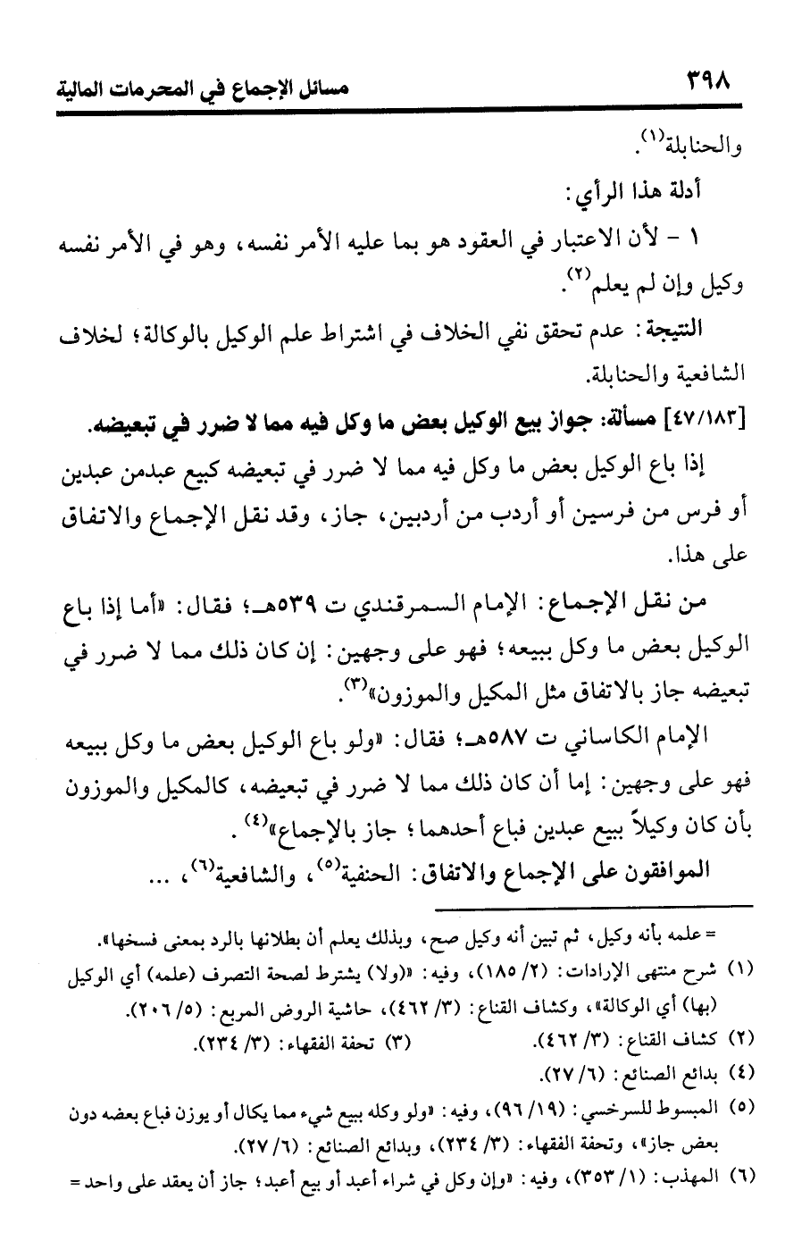• من نقل الإجماع: الإمام السمرقندي ت 539 هـ؛ فقال: "أما إذا باع الوكيل بعض ما وكل ببيعه؛ فهو على وجهين: إن كان ذلك مما لا ضرر في تبعيضه جاز بالاتفاق مثل المكيل والموزون" (¬3).