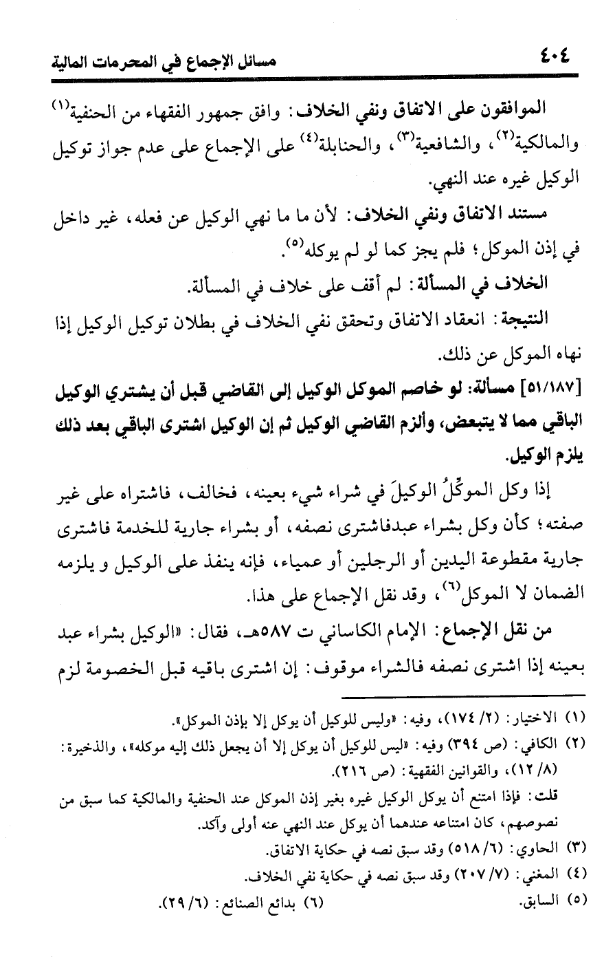 • من نقل الإجماع: الإمام الكاساني ت 587 هـ، فقال: "الوكيل بشراء عبد بعينه إذا اشترى نصفه فالشراء موقوف: إن اشترى باقيه قبل الخصومة لزم
