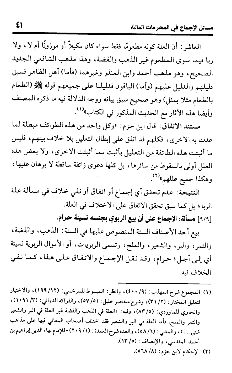 • مستند الاتفاق: قال ابن حزم: "وكل واحد من هذه الطوائف مبطلة لما عدت به الأخرى، فكلهم قد اتفق على إبطال التعليل بلا خلاف بينهم، فليس ما أثبتت هذه الطائفة من التعليل بأثبت مما أثبتت الأخرى، ولا بعض هذه العلل أولى بالسقوط من سائرها، بل كلها دعوى زائفة ساقطة لا برهان عليها، وهكذا جميع عللهم" (¬2).Rعدم تحقق أي إجماع أو اتفاق أو نفي خلاف في مسألة علة الربا؛ بل كما سبق تحقق الاتفاق على الاختلاف في العلة.