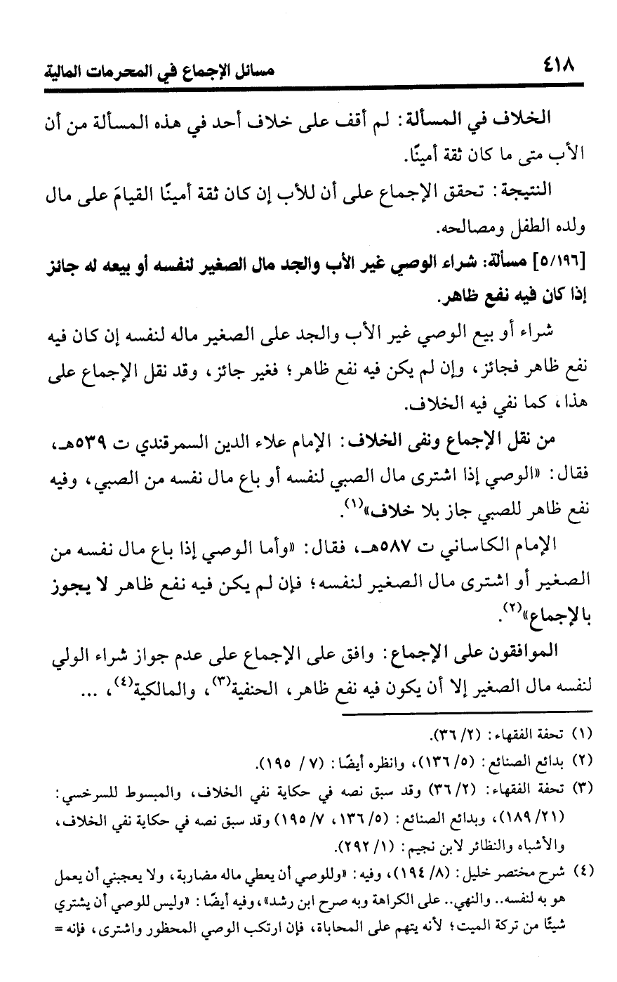 • من نقل الإجماع ونفى الخلاف: الإمام علاء الدين السمرقندي ت 539 هـ، فقال: "الوصي إذا اشترى مال الصبي لنفسه أو باع مال نفسه من الصبي، وفيه نفع ظاهر للصبي جاز بلا خلاف" (¬1).