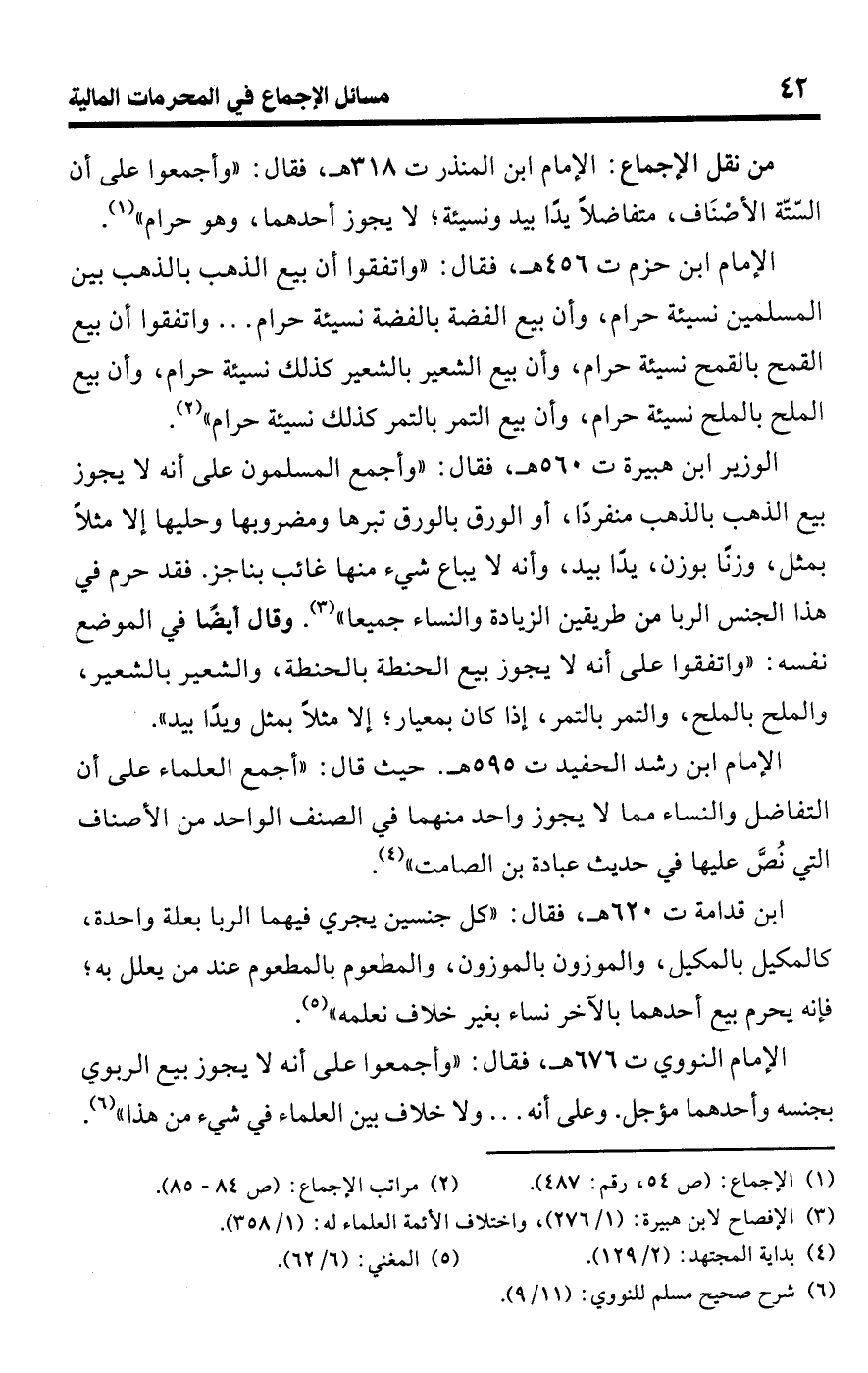 الإمام ابن حزم ت 456 هـ، فقال: "واتفقوا أن بيع الذهب بالذهب بين المسلمين نسيئة حرام، وأن بيع الفضة بالفضة نسيئة حرام. . . واتفقوا أن بيع القمح بالقمح نسيئة حرام، وأن بيع الشعير بالشعير كذلك نسيئة حرام، وأن بيع الملح بالملح نسيئة حرام، وأن بيع التمر بالتمر كذلك نسيئة حرام" (¬2).