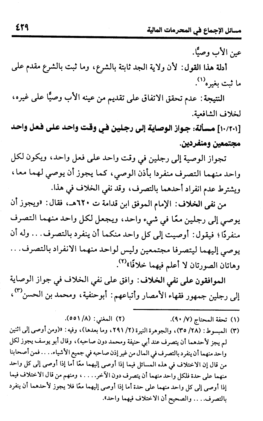 • من نفى الخلاف: الإمام الموفق ابن قدامة ت 620 هـ، فقال: "ويجوز أن يوصي إلى رجلين معًا في شيء واحد، ويجعل لكل واحد منهما التصرف منفردًا؛ فيقول: أوصيت إلى كل واحد منكما أن ينفرد بالتصرف. . . وله أن يوصي إليهما ليتصرفا مجتمعين وليس لواحد منهما الانفراد بالتصرف. . . وهاتان الصورتان لا أعلم فيهما خلافًا" (¬2).
