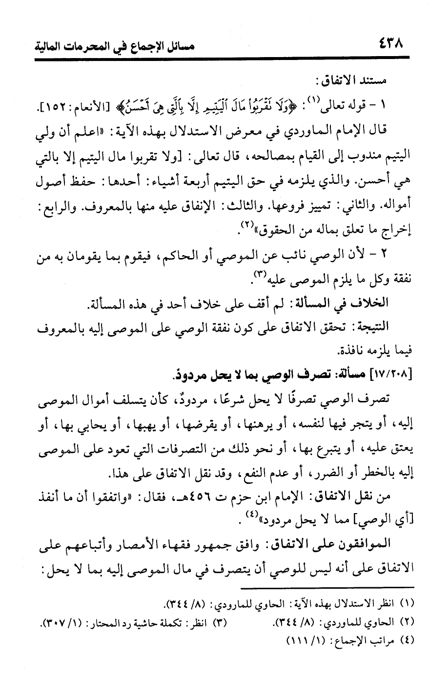 • من نقل الاتفاق: الإمام ابن حزم ت 456 هـ، فقال: "واتفقوا أن ما أنفذ [أي الوصي] مما لا يحل مردود" (¬4).