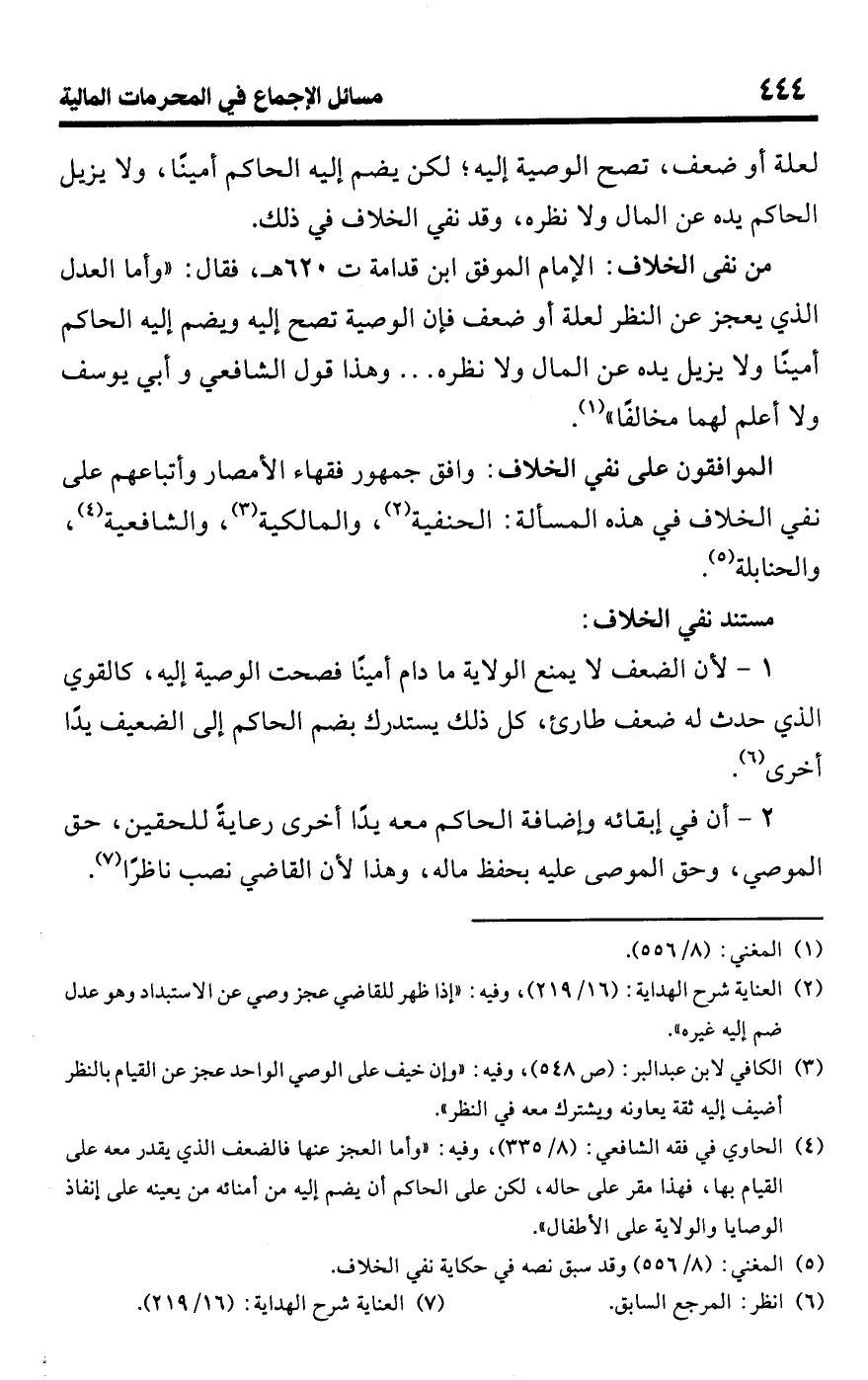 • من نفى الخلاف: الإمام الموفق ابن قدامة ت 620 هـ، فقال: "وأما العدل الذي يعجز عن النظر لعلة أو ضعف فإن الوصية تصح إليه ويضم إليه الحاكم أمينًا ولا يزيل يده عن المال ولا نظره. . . وهذا قول الشافعي وأبي يوسف ولا أعلم لهما مخالفًا" (¬1).