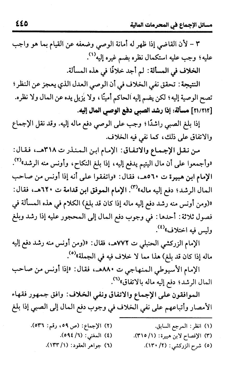 • من نقل الإجماع والاتفاق: الإمام ابن المنذر ت 318 هـ، فقال: "وأجمعوا على أن مال اليتيم يدفع إليه، إذا بلغ النكاح، وأونس منه الرشد" (¬2). الإمام ابن هبيرة ت 560 هـ، فقال: "واتفقوا على أنه إذا أونس من صاحب المال الرشد؛ دفع إليه ماله" (¬3). الإمام الموفق ابن قدامة ت 620 هـ، فقال: " (ومن أونس منه رشد دفع إليه ماله إذا كان قد بلغ) الكلام في هذه المسألة في فصول ثلاثة: أحدها: في وجوب دفع المال إلى المحجور عليه إذا رشد وبلغ وليس فيه اختلاف" (¬4).