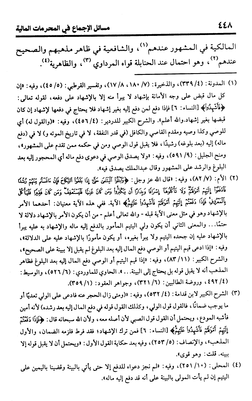 (¬4) المحلى: (10/ 251)، وفيه: "لم نجز دعواه للدفع إلا حتى يأتي بالبينة وقضينا باليمين على اليتيم إن لم يأت المولى بالبينة على أنه قد دفع إليه ماله ".