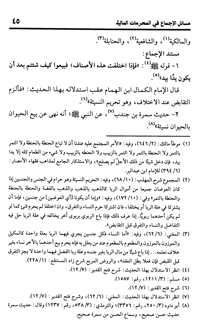 قال الإمام الكمال ابن الهمام عقب استدلاله بهذا الحديث: "فألزم التقابض عند الاختلاف، وهو تحريم النسيئة" (¬6).