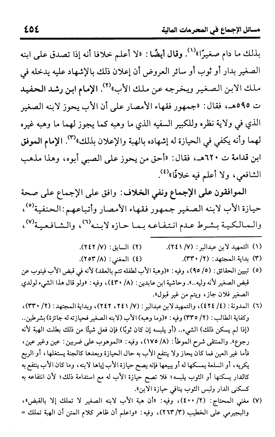 • الموافقون على الإجماع ونفي الخلاف: وافق على الإجماع على صحة حيازة الأب لابنه الصغير جمهور فقهاء الأمصار وأتباعهم: الحنفية (¬5)، والمالكية بشرط عدم انتفاعه بما حازه لابنه (¬6)، والشافعية (¬7)،