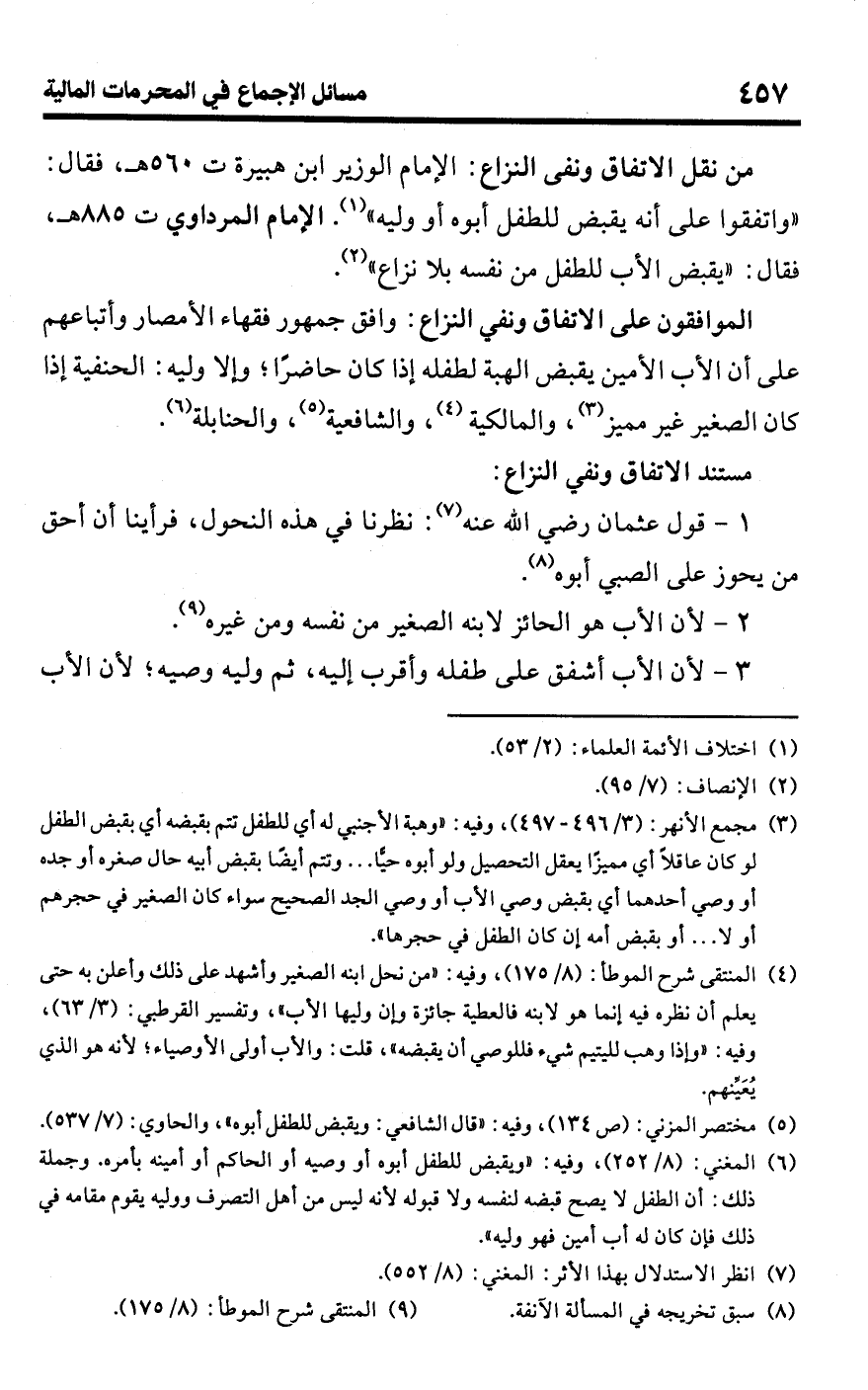 • من نقل الاتفاق ونفى النزاع: الإمام الوزير ابن هبيرة ت 560 هـ، فقال: "واتفقوا على أنه يقبض للطفل أبوه أو وليه" (¬1). الإمام المرداوي ت 885 هـ، فقال: "يقبض الأب للطفل من نفسه بلا نزاع" (¬2).
