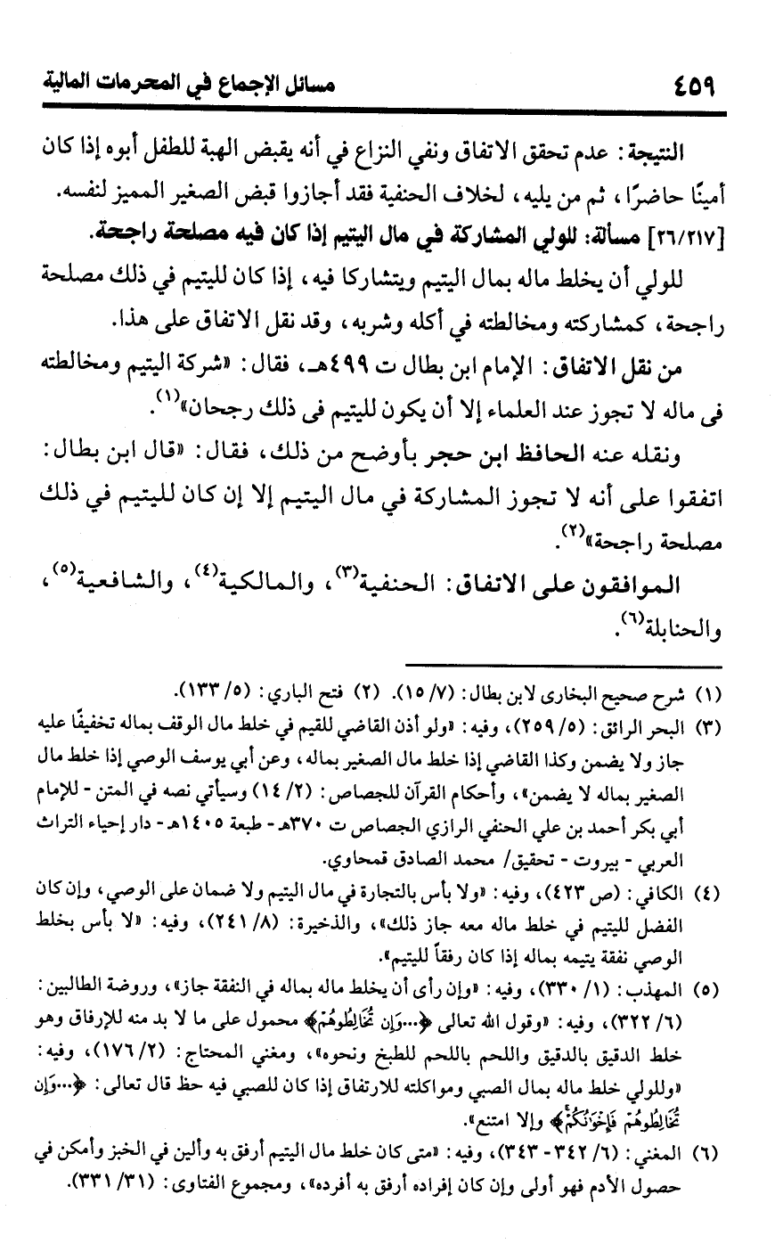 ونقله عنه الحافظ ابن حجر بأوضح من ذلك، فقال: "قال ابن بطال: اتفقوا على أنه لا تجوز المشاركة في مال اليتيم إلا إن كان لليتيم في ذلك مصلحة راجحة" (¬2).