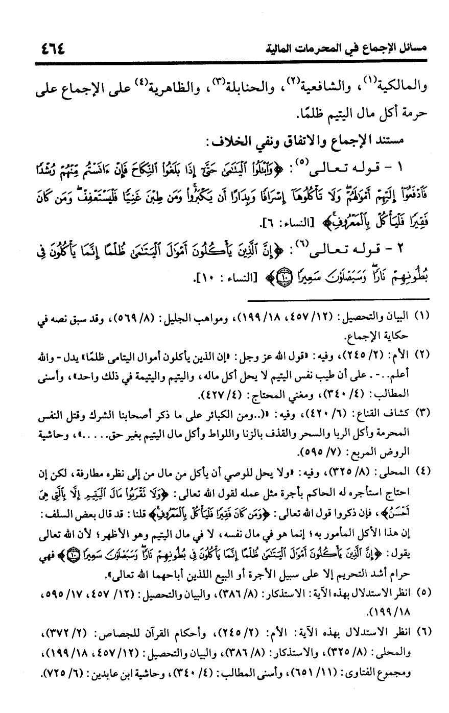 (¬2) الأم: (2/ 245)، وفيه: "قول اللَّه عز وجل: "إن الذين يأكلون أموال اليتامى ظلمًا، يدل -واللَّه أعلم. . -. على أن طيب نفس اليتيم لا يحل أكل ماله، واليتيم واليتيمة في ذلك واحد"، وأسنى المطالب: (4/ 340)، ومغني المحتاج: (4/ 427).