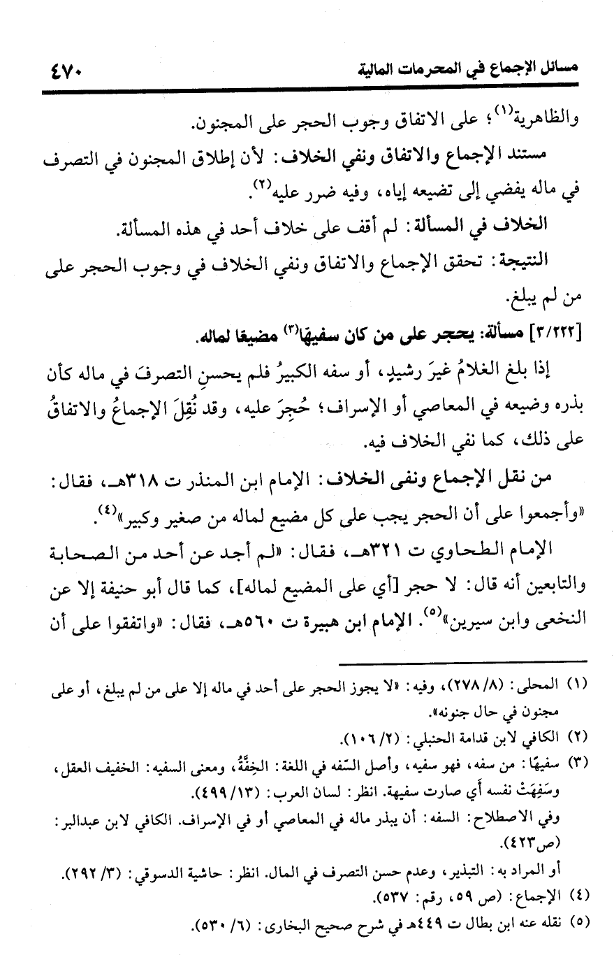 • من نقل الإجماع ونفى الخلاف: الإمام ابن المنذر ت 318 هـ، فقال: "وأجمعوا على أن الحجر يجب على كل مضيع لماله من صغير وكبير" (¬4).