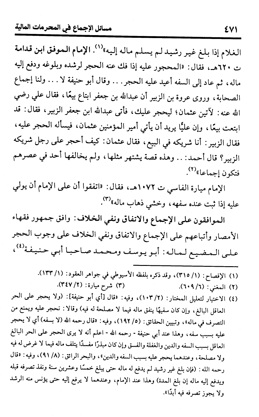 الغلام إذا بلغ غير رشيد لم يسلم ماله إليه" (¬1). الإمام الموفق ابن قدامة ت 620 هـ، فقال: "المحجور عليه إذا فك عنه الحجر لرشده وبلوغه ودفع إليه ماله، ثم عاد إلى السفه أعيد عليه الحجر. . . وقال أبو حنيفة لا. . . ولنا إجماع الصحابة، وروى عروة بن الزبير أن عبد اللَّه بن جعفر ابتاع بيعًا، فقال علي رضى اللَّه عنه: لآتين عثمان؛ ليحجر عليك، فأتى عبد اللَّه ابن جعفر الزبير، فقال: قد ابتعت بيعًا، وإن عليًّا يريد أن يأتي أمير المؤمنين عثمان، فيسأله الحجر عليه، فقال الزبير: أنا شريكه في البيع، فقال عثمان: كيف أحجر على رجل شريكه الزبير؛ قال أحمد: . . وهذه قصة يشتهر مثلها، ولم يخالفها أحد في عصرهم فتكون إجماعا" (¬2).