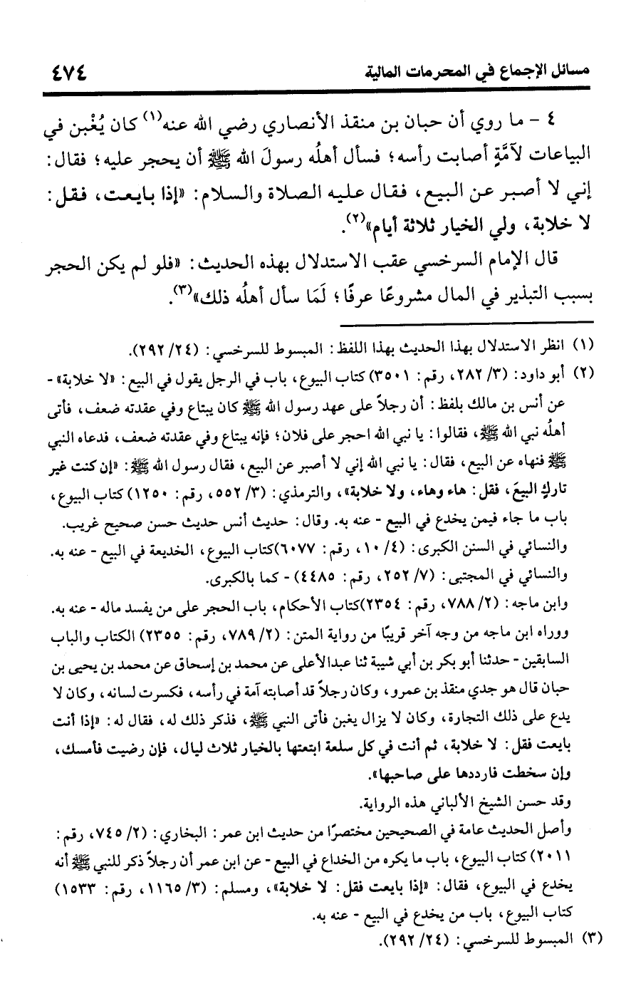(¬2) أبو داود: (3/ 282، رقم: 3501) كتاب البيوع، باب في الرجل يقول في البيع: "لا خلابة" -عن أنس بن مالك بلفظ: أن رجلًا على عهد رسول اللَّه -صلى اللَّه عليه وسلم- كان يبتاع وفي عقدته ضعف، فأتى أهلُه نبي اللَّه -صلى اللَّه عليه وسلم-، فقالوا: يا نبي اللَّه احجر على فلان؛ فإنه يبتاع وفي عقدته ضعف، فدعاه النبي -صلى اللَّه عليه وسلم- فنهاه عن البيع، فقال: يا نبي اللَّه إني لا أصبر عن البيع، فقال رسول اللَّه -صلى اللَّه عليه وسلم-: "إن كنت غير تارك البيعَ، فقل: هاء وهاء، ولا خلابة"، والترمذي: (3/ 552، رقم: 1250) كتاب البيوع، باب ما جاء فيمن يخدع في البيع -عنه به. وقال: حديث أنى حديث حسن صحيح غريب. والنسائي في السنن الكبرى: (4/ 10، رقم: 6577) كتاب البيوع، الخديعة في البيع -عنه به. والنسائي في المجتبى: (7/ 252، رقم: 4485) -كما بالكبرى.
