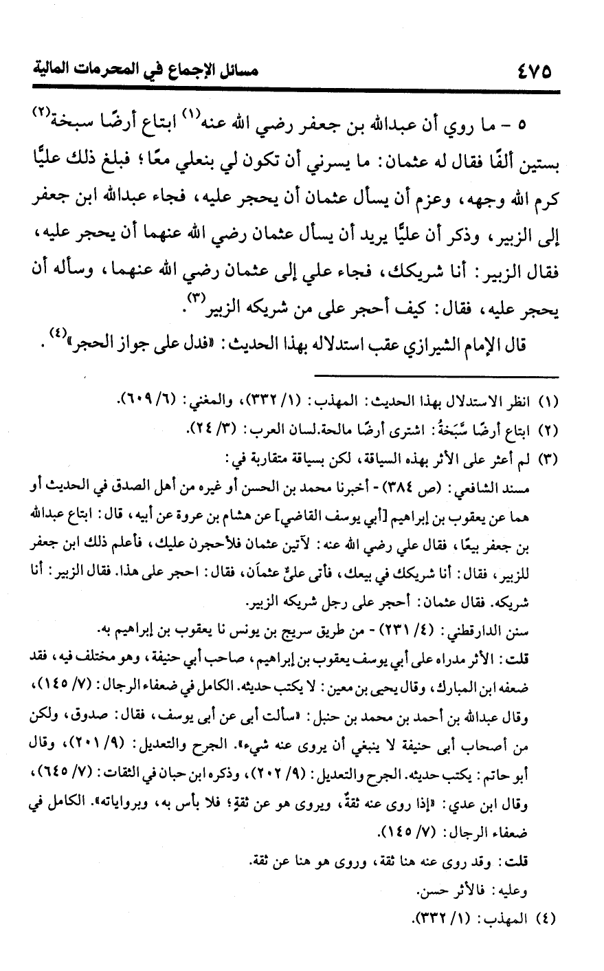 مسند الشافعي: (ص 384) - أخبرنا محمد بن الحسن أو غيره من أهل الصدق في الحديث أو هما عن يعقوب بن إبراهيم [أبي يوسف القاضي] عن هشام بن عروة عن أبيه، قال: ابتاع عبد اللَّه بن جعفر بيعًا، فقال علي رضي اللَّه عنه: لآتين عثمان فلأحجرن عليك، فاعلم ذلك ابن جعفر للزبير، فقال: أنا شريكك في بيعك، فأتى عليٌّ عثمان، فقال: احجر على هذا. فقال الزبير: أنا شريكه. فقال عثمان: أحجر على رجل شريكه الزبير.