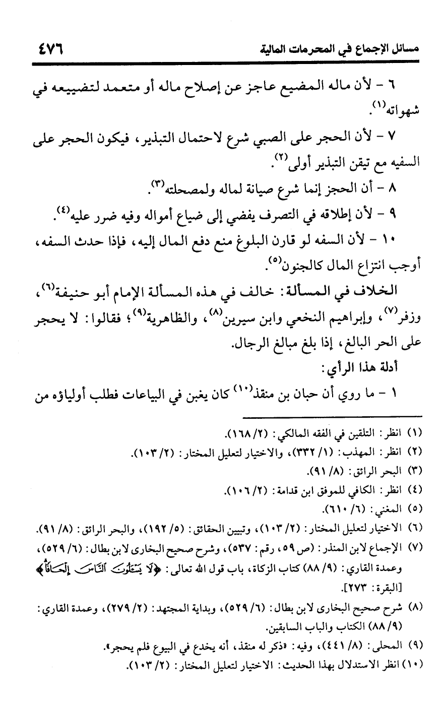 • الخلاف في المسألة: خالف في هذه المسألة الإمام أبو حنيفة (¬6)، وزفر (¬7)، وإبراهيم النخعي وابن سيرين (¬8)، والظاهرية (¬9)، فقالوا: لا يحجر على الحر البالغ، إذا بلغ مبالغ الرجال.