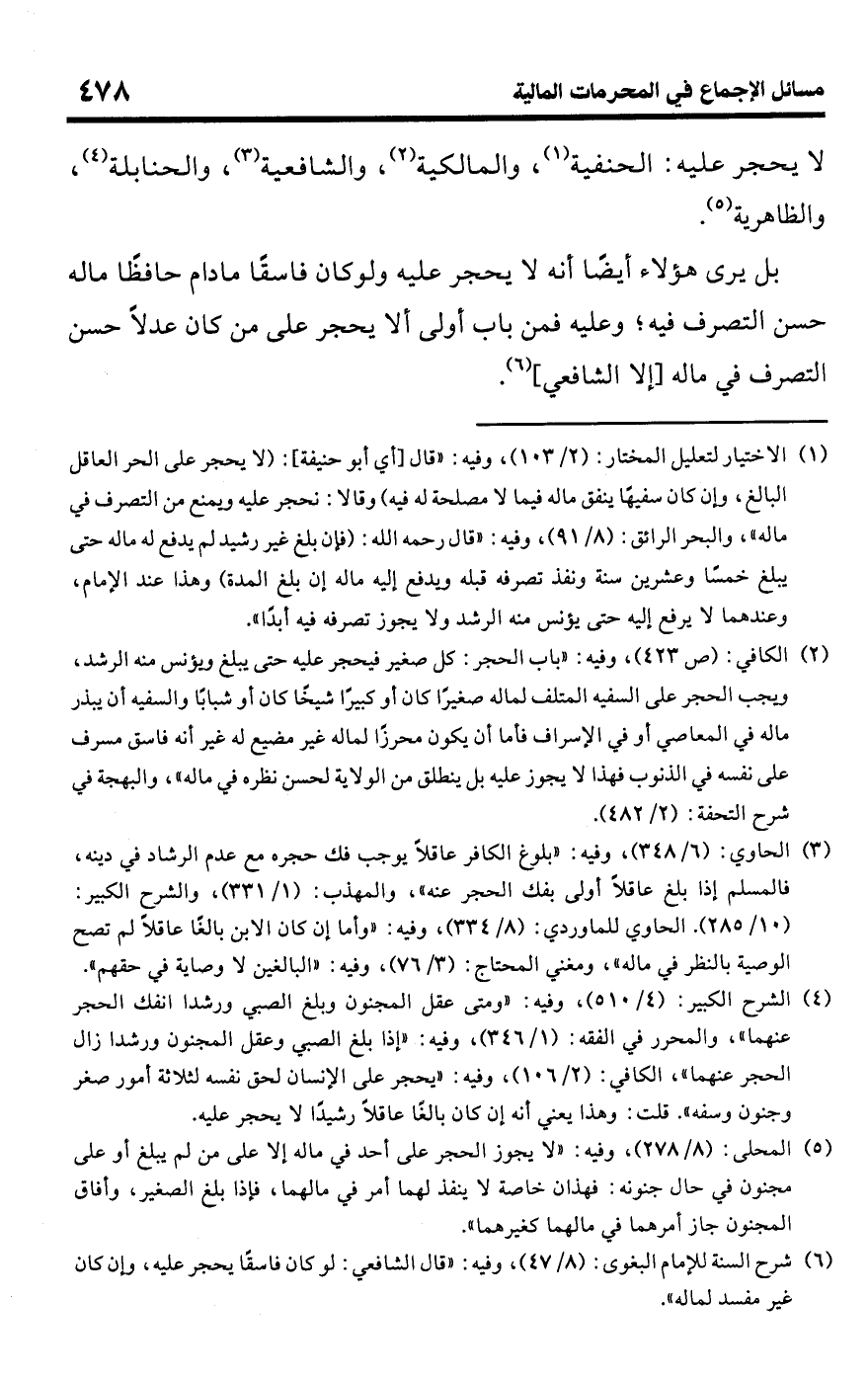 (¬5) المحلى: (8/ 278)، وفيه: "لا يجوز الحجر على أحد في ماله إلا على من لم يبلغ أو على مجنون في حال جنونه: فهذان خاصة لا ينفذ لهما أمر في مالهما، فإذا بلغ الصغير، وأفاق المجنون جاز أمرهما في مالهما كغيرهما".