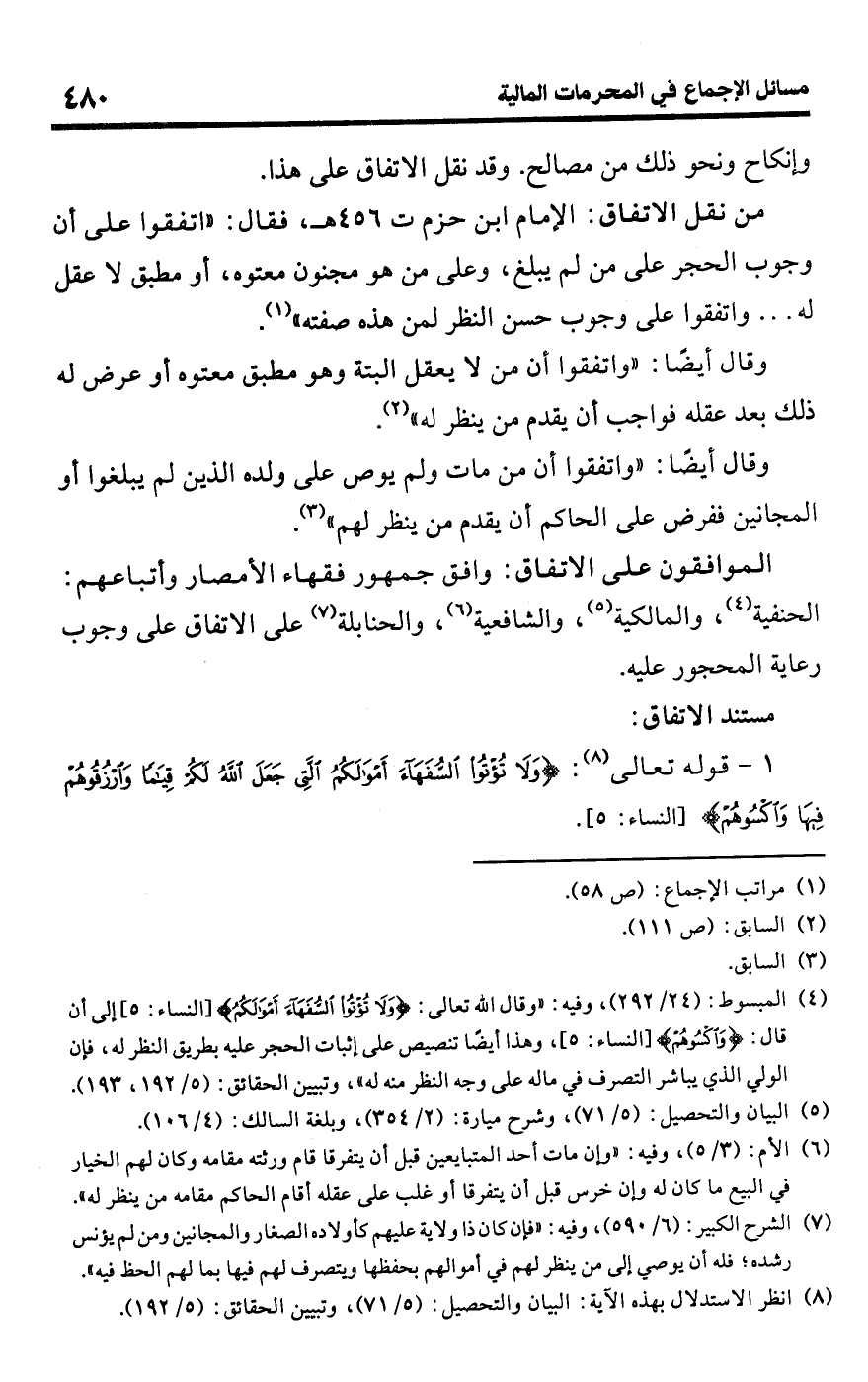 • من نقل الاتفاق: الإمام ابن حزم ت 456 هـ، فقال: "اتفقوا على أن وجوب الحجر على من لم يبلغ، وعلى من هو مجنون معتوه، أو مطبق لا عقل له. . . واتفقوا على وجوب حسن النظر لمن هذه صفته" (¬1).