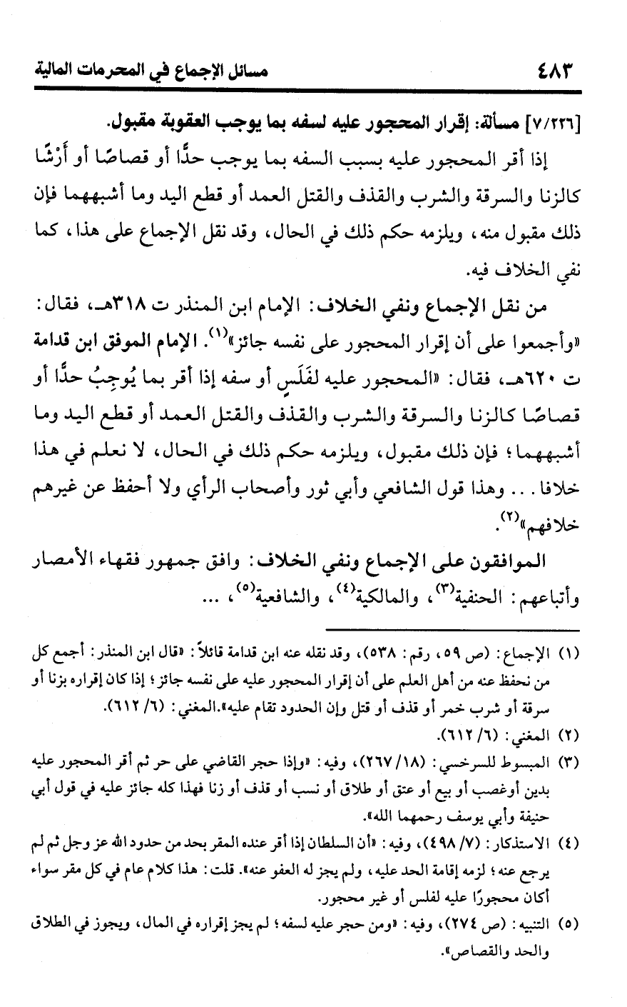 (¬1) الإجماع: (ص 59، رقم: 538)، وقد نقله عنه ابن قدامة قائلًا: (قال ابن المنذر: أجمع كل من نحفظ عنه من أهل العلم على أن إقرار المحجور عليه على نفسه جائز؛ إذا كان إقراره بزنا أو سرقة أو شرب خمر أو قذف أو قتل وإن الحدود تقام عليه). المغني: (6/ 612).