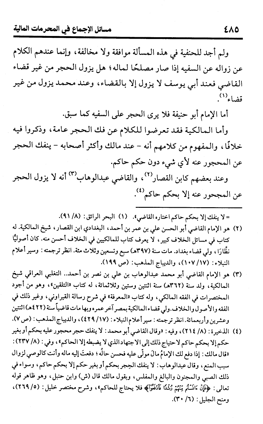 (¬4) الذخيرة: (8/ 214)، وفيه: "وقال القاضي أبو محمد: لا ينفك حجر محجور عليه بحكم أو بغير حكم إلا بحكم حاكم لاحتياج ذلك إلى الاجتهاد الذي لا يضبطه إلا الحاكم"، وفي: (8/ 237): "قال مالك: إذا دفع لك الإمامُ مالَ مولًى عليه فحسن حالُه؛ دفعتَ إليه ماله وأنت كالوصي لزوال سبب المنع، وقال عبد الوهاب: لا ينفك الحِجر بحكم أو بغير حكم إلا بحكم حاكم، وسواء في ذلك الصبي والمجنون والبالغ والمفلس، ويقول مالك قال (ش) وابن حنبل، وهو ظاهر قوله تعالى: {فَإِنْ آنَسْتُمْ مِنْهُمْ رُشْدًا فَادْفَعُوا} فلا يحتاج للحاكم"، وشرح مختصر خليل: (5/ 269)، ومنح الجليل: (6/ 30).