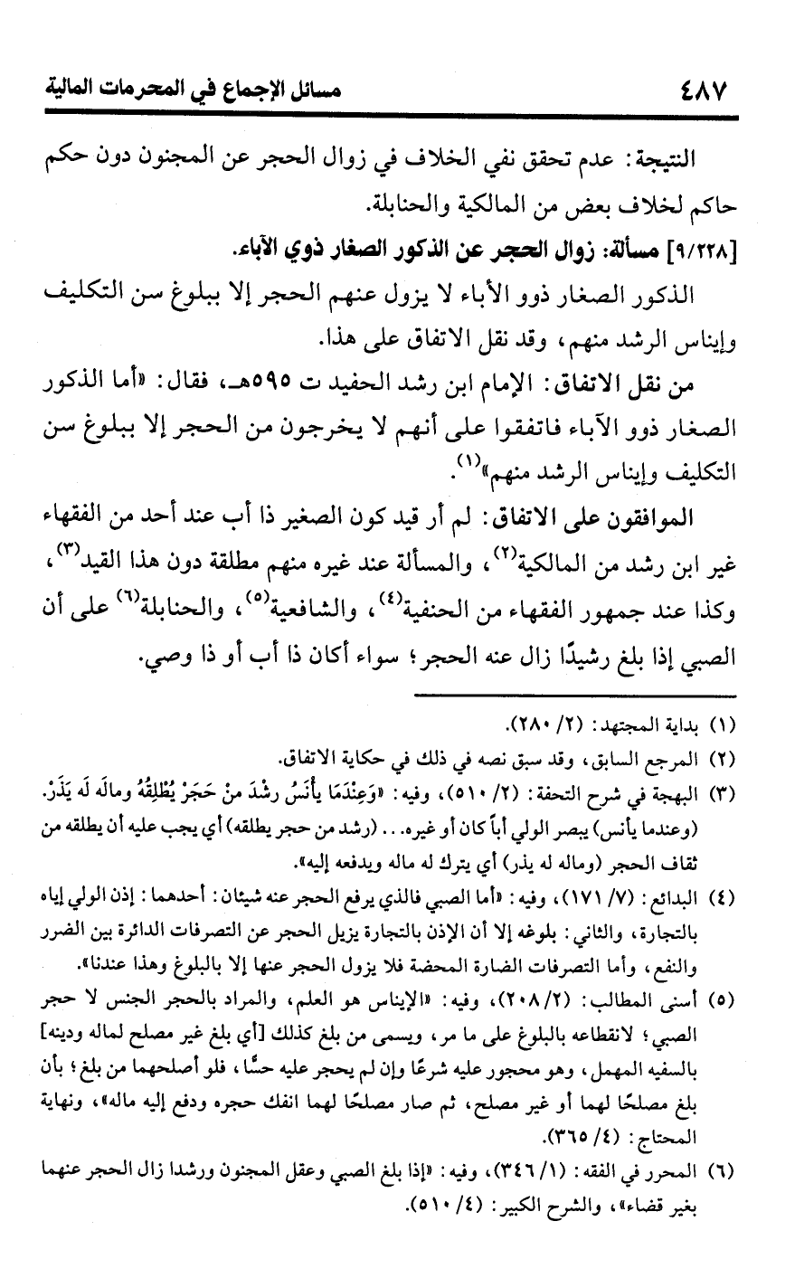 • من نقل الاتفاق: الإمام ابن رشد الحفيد ت 595 هـ، فقال: "أما الذكور الصغار ذوو الآباء فاتفقوا على أنهم لا يخرجون من الحجر إلا ببلوغ سن التكليف وإيناس الرشد منهم" (¬1).
