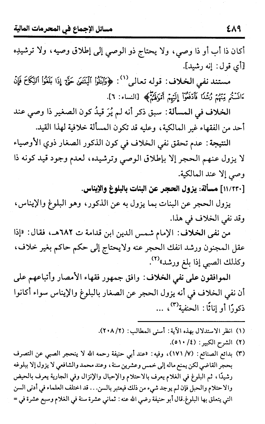 • مستند نفي الخلاف: قوله تعالى (¬1): {وَابْتَلُوا الْيَتَامَى حَتَّى إِذَا بَلَغُوا النِّكَاحَ فَإِنْ آنَسْتُمْ مِنْهُمْ رُشْدًا فَادْفَعُوا إِلَيْهِمْ أَمْوَالَهُمْ} [النساء: 6].