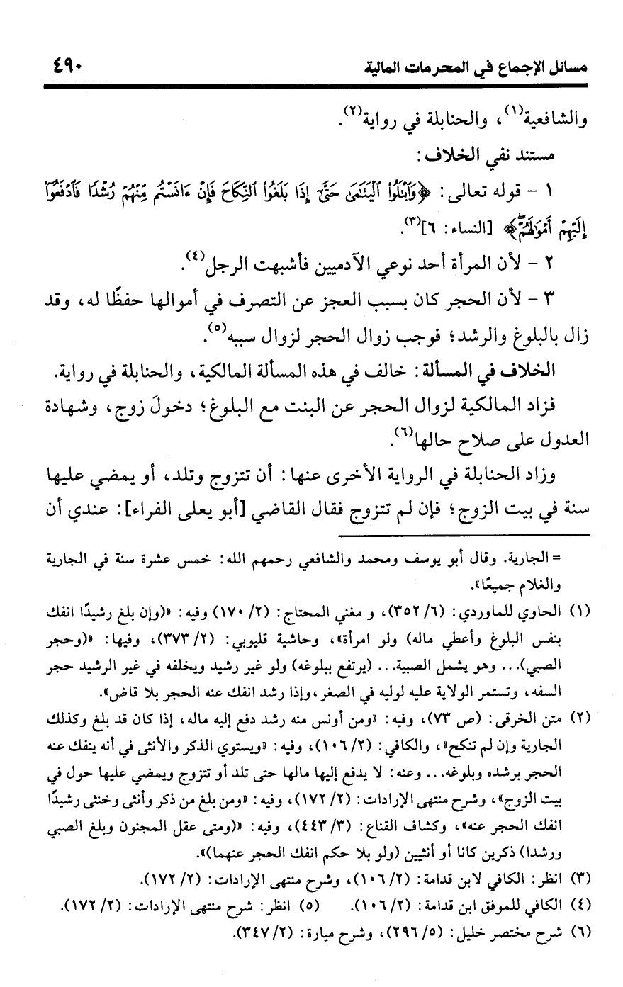 (¬2) متن الخرقي: (ص 73)، وفيه: "ومن أونس منه رشد دفع إليه ماله، إذا كان قد بلغ وكذلك الجارية وإن لم تنكح"، والكافي: (2/ 106)، وفيه: "ويستوي الذكر والأنثى في أنه ينفك عنه الحجر برشده وبلوغه. . . وعنه: لا يدفع إليها مالها حتى تلد أو تتزوج ويمضي عليها حول في بيت الزوج"، وشرح منتهى الإرادات: (2/ 172)، وفيه: "ومن بلغ من ذكر وأنثى وخنثى رشيدًا انفك الحجر عنه"، وكشاف القناع: (3/ 443)، وفيه: " (ومتى عقل المجنون وبلغ الصبي ورشدا) ذكرين كانا أو انثيين (ولو بلا حكم انفك الحجر عنهما) ".