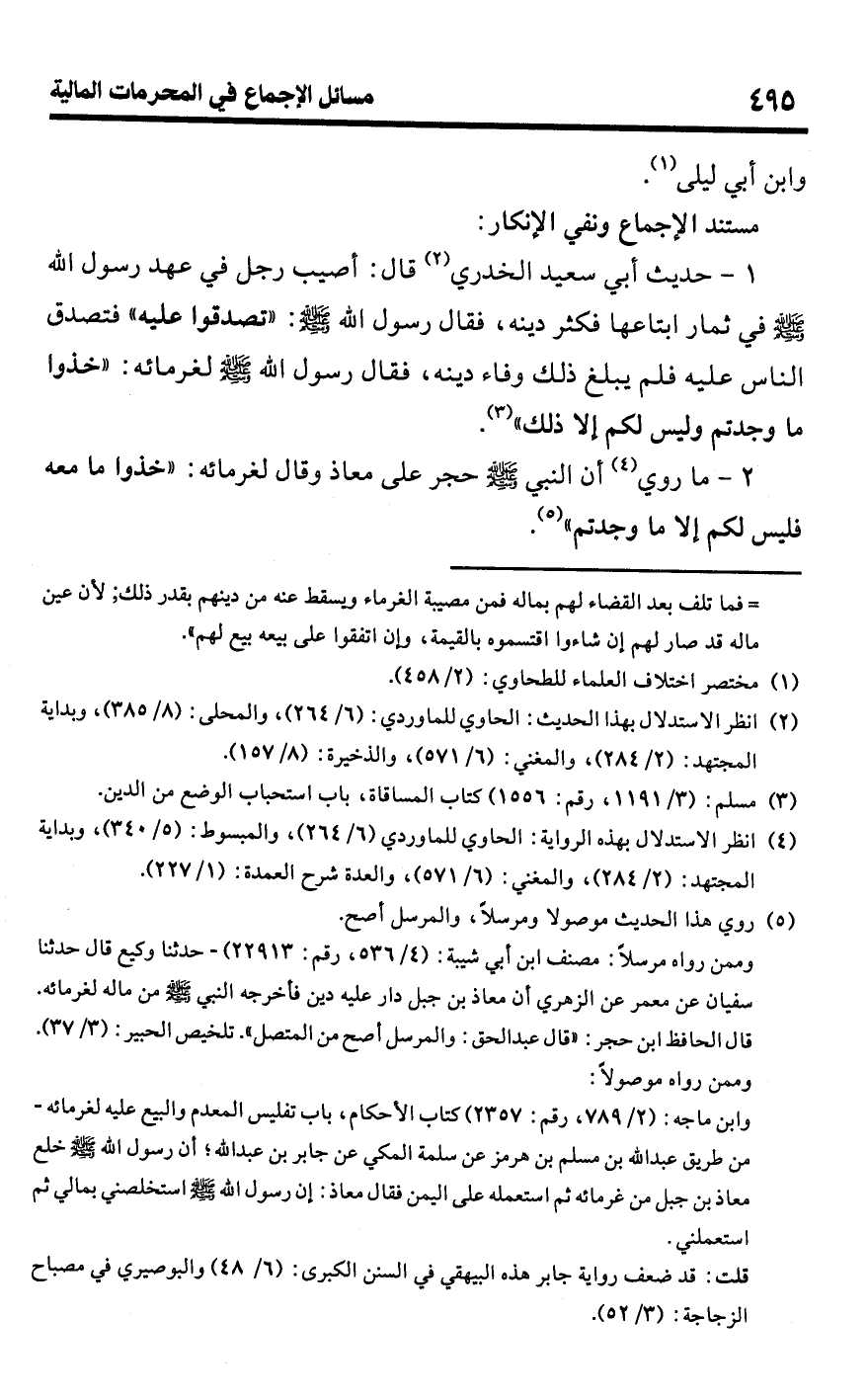 (¬4) انظر الاستدلال بهذه الرواية: الحاوي للماوردي (6/ 264)، والمبسوط: (5/ 340)، وبداية المجتهد: (2/ 284)، والمغني: (6/ 571)، والعدة شرح العمدة: (1/ 227).