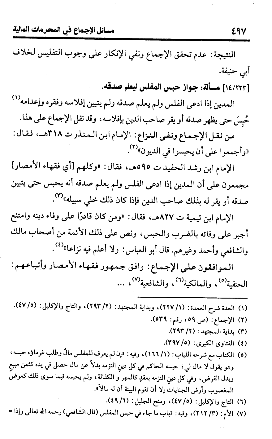 الإمام ابن رشد الحفيد ت 595 هـ، فقال: "وكلهم [أي فقهاء الأمصار] مجمعون على أن المدين إذا ادعى الفلس ولم يعلم صدقه أنه يحبس حتى يتبين صدقه أو يقر له بذلك صاحب الدين فإذا كان ذلك خلي سبيله" (¬3).