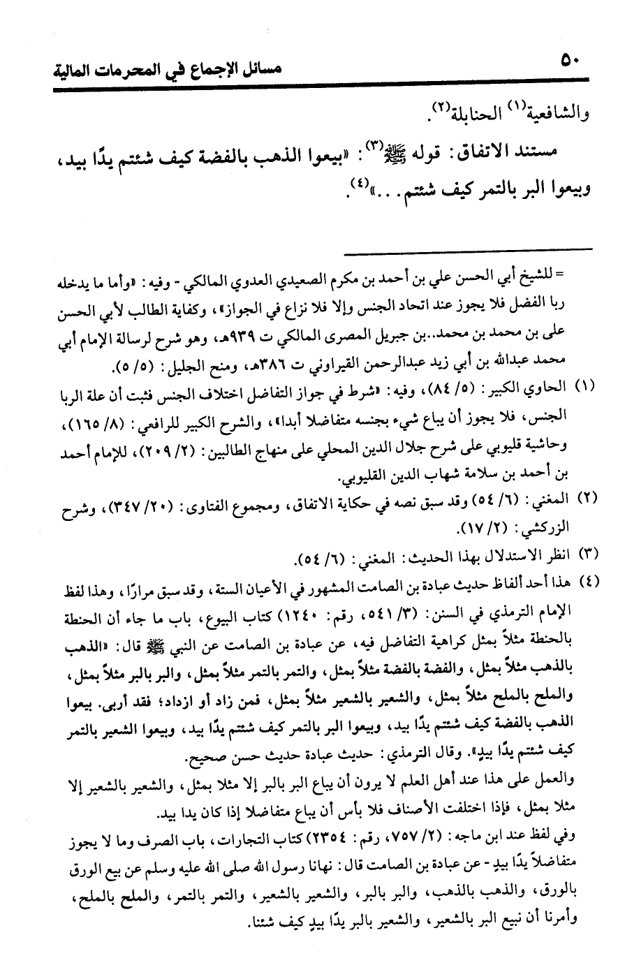 (¬4) هذا أحد ألفاظ حديث عبادة بن الصامت المشهور في الأعيان الستة، وقد سبق مرارًا، وهذا لفظ الإمام الترمذي في السنن: (3/ 541، رقم: 1240) كتاب البيوع، باب ما جاء أن الحنطة بالحنطة مثلًا بمثل كراهية التفاضل فيه، عن عبادة بن الصامت عن النبي -صلى اللَّه عليه وسلم- قال: "الذهب بالذهب مثلًا بمثل، والفضة بالفضة مثلًا بمثل، والتمر بالتمر مثلًا بمثل، والبر بالبر مثلًا بمثل، والملح بالملح مثلًا بمثل، والشعير بالشعير مثلًا بمثل، فمن زاد أو ازداد؛ فقد أربى. بيعوا الذهب بالفضة كيف شئتم يدًا بيد، وبيعوا البر بالتمر كيف شئتم يدًا بيد، وبيعوا الشعير بالتمر كيف شئتم يدًا بيدٍ". وقال الترمذي: حديث عبادة حديث حسن صحيح.