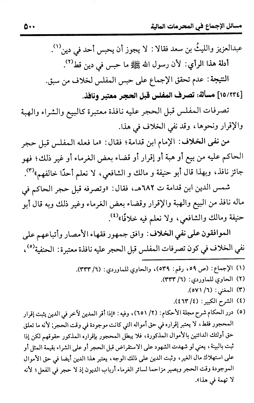 • من نفى الخلاف: الإمام ابن قدامة؛ فقال: "ما فعله المفلس قبل حجر الحاكم عليه من بيع أو هبة أو إقرار أو قضاء بعض الغرماء أو غير ذلك؛ فهو جائز نافذ، وبهذا قال أبو حنيفة ومالك والشافعي، لا نعلم أحدًا خالفهم" (¬3).