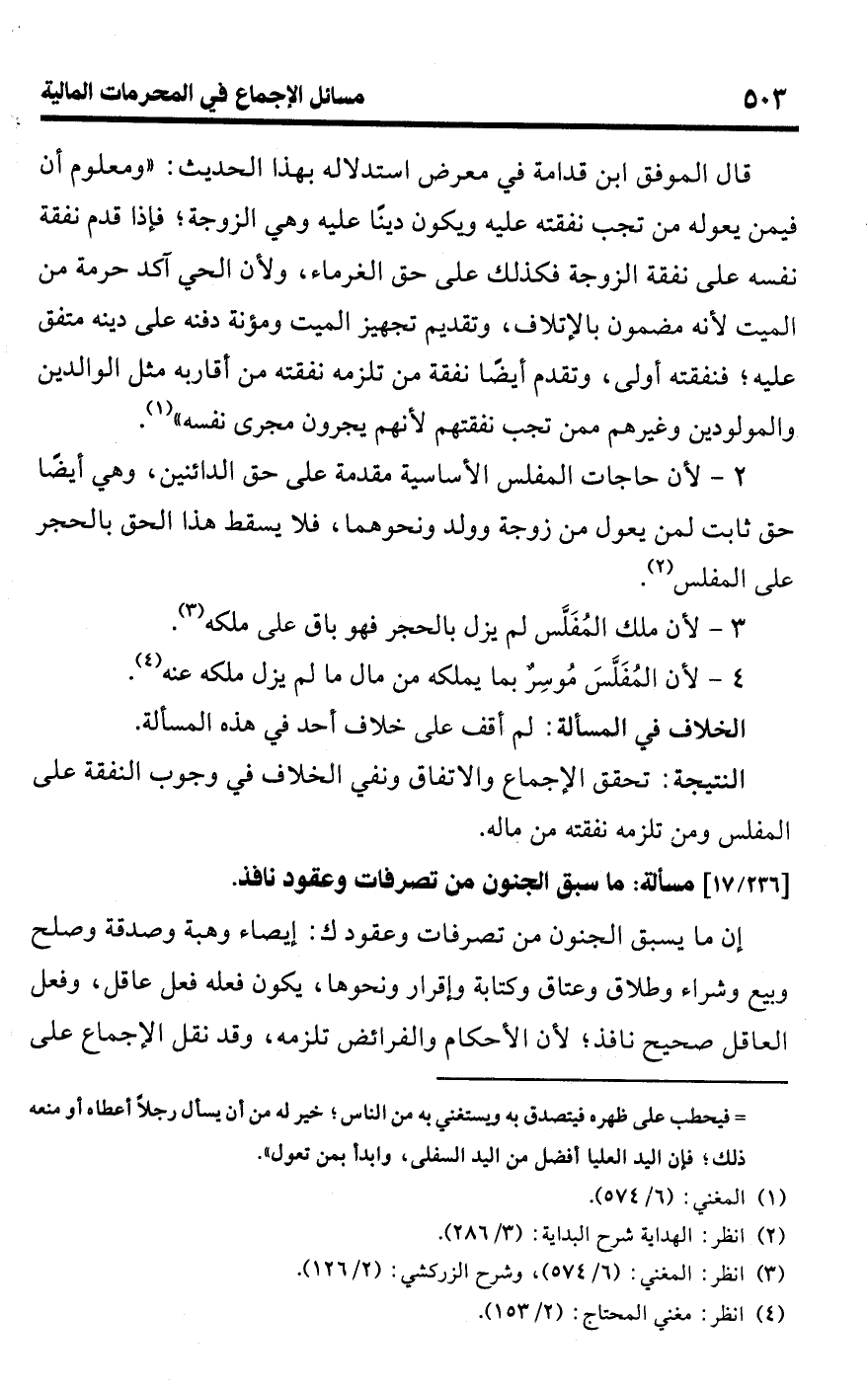 • الخلاف في المسألة: لم أقف على خلاف أحد في هذه المسألة.Rتحقق الإجماع والاتفاق ونفي الخلاف في وجوب النفقة على المفلس ومن تلزمه نفقته من ماله.