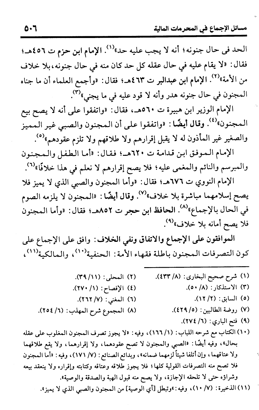 • الموافقون على الإجماع والاتفاق ونفي الخلاف: وافق على الإجماع على كون التصرفات المجنون باطلة فقهاء الأمة: الحنفية (¬10)، والمالكية (¬11)،