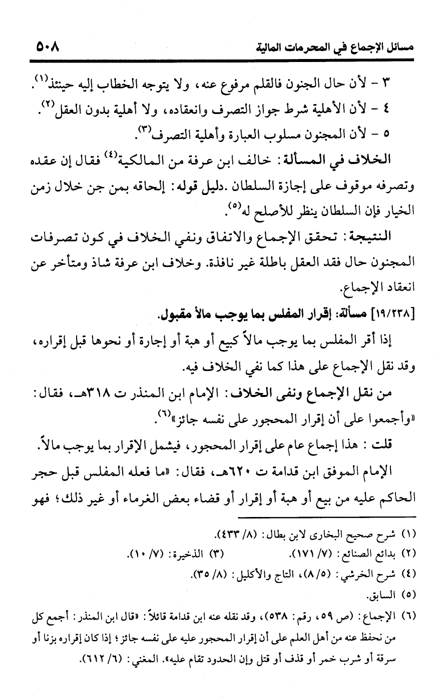 (¬6) الإجماع: (ص 59، رقم: 538)، وقد نقله عنه ابن قدامة قائلًا: "قال ابن المنذر: أجمع كل من نحفظ عنه من أهل العلم على أن إقرار المحجور عليه على نفسه جائز؛ إذا كان إقراره بزنا أو سرقة أو شرب خمر أو قذف أو قتل وإن الحدود تقام عليه". المغني: (6/ 612).